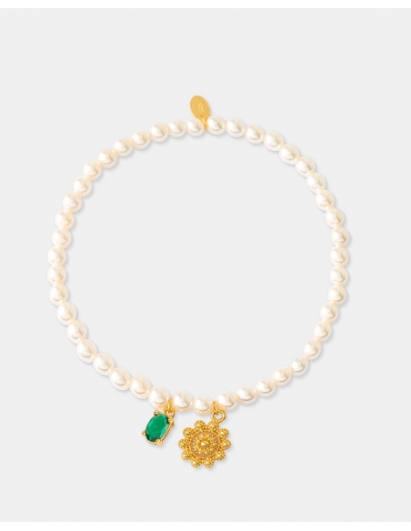 PULSERA PERLAS 4.5MM - BOTON CHARRO 11MM - CIRCONITA ESMERALDA - ELASTICA - DO ZV