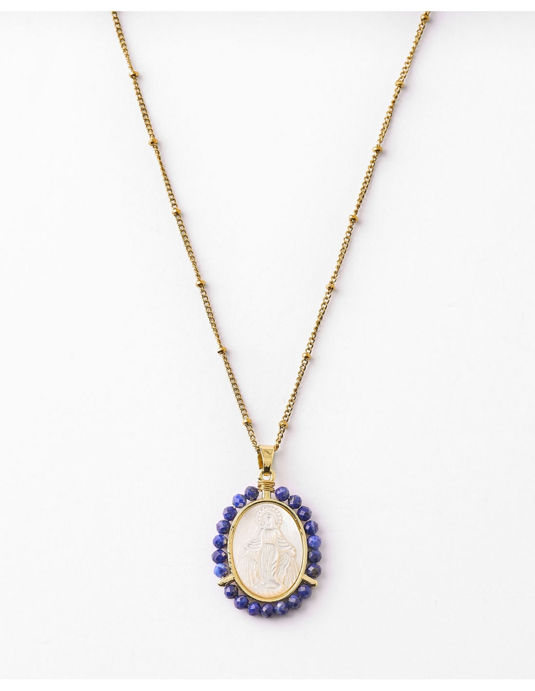 COLLAR MEDALLA NACAR VIRGEN MILAGROSA 31x23MM - PIEDRAS LAPISLAZULI 3MM - 42+5CM LARGO