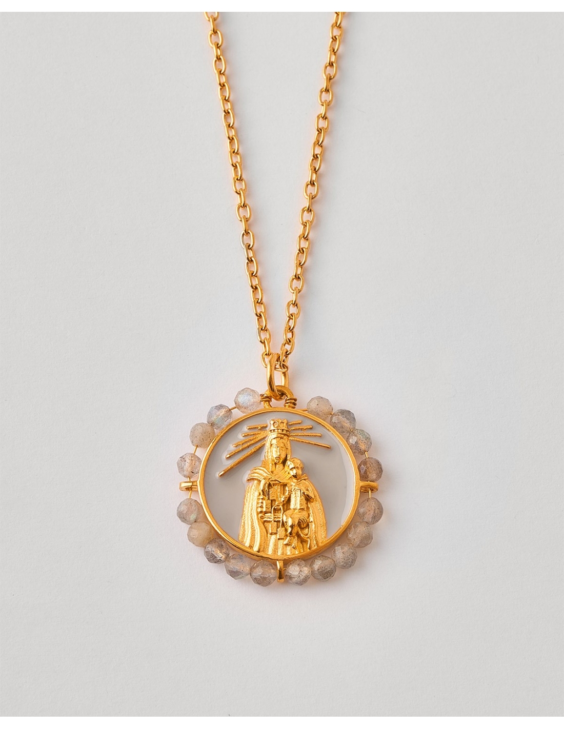 Collar Acero Medalla Virgen 20mm Piedras Labradorita 3mm LA
